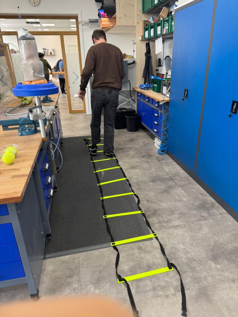 Dann übernahm Martin und „drohte“ intensive Übungsstunden an. Er kannte die Teilnehmer,meist digital, er hatte uns schon auf Videos begutachten und analysieren können. Nach kurzer Einführung hieß es Aufstehen, Hinsetzen, Aufstehen, Hinsetzen. Nicht leicht, ohne Hände! Danach folgte ein ausführliches und auch anstrengendes Übungsprogramm. Kurze Schritte, lange Schritte, Slalom, Hütchenlaufen, über eine liegende Leiter mit Tennisbällen balancieren, schnell laufen, langsam laufen, rückwärts laufen und zum Schluss Treppen steigen, Schräge laufen (jilden). Königsdisziplin für uns – alternierend Treppen steigen! Die Begeisterung war zu spüren – es bringt was, und ist für jeden äußerst wichtig,die Gehschule! Es gibt ordentlich Ansporn, auch Druck und braucht manchmal auch Mut, besonders beim Falltraining oder danach dem Aufstehen.