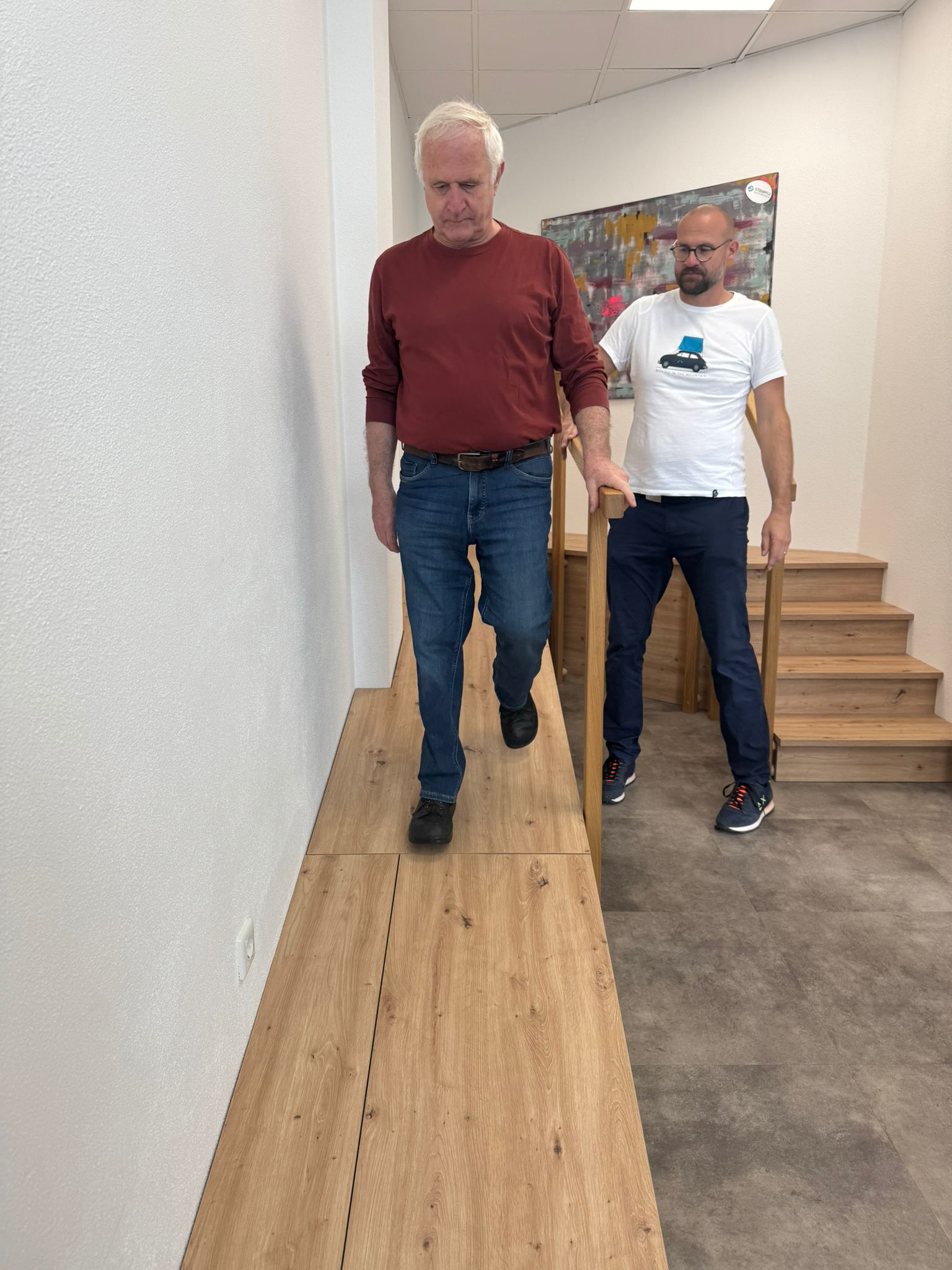 Dann übernahm Martin und „drohte“ intensive Übungsstunden an. Er kannte die Teilnehmer,meist digital, er hatte uns schon auf Videos begutachten und analysieren können. Nach kurzer Einführung hieß es Aufstehen, Hinsetzen, Aufstehen, Hinsetzen. Nicht leicht, ohne Hände! Danach folgte ein ausführliches und auch anstrengendes Übungsprogramm. Kurze Schritte, lange Schritte, Slalom, Hütchenlaufen, über eine liegende Leiter mit Tennisbällen balancieren, schnell laufen, langsam laufen, rückwärts laufen und zum Schluss Treppen steigen, Schräge laufen (jilden). Königsdisziplin für uns – alternierend Treppen steigen! Die Begeisterung war zu spüren – es bringt was, und ist für jeden äußerst wichtig,die Gehschule! Es gibt ordentlich Ansporn, auch Druck und braucht manchmal auch Mut, besonders beim Falltraining oder danach dem Aufstehen.