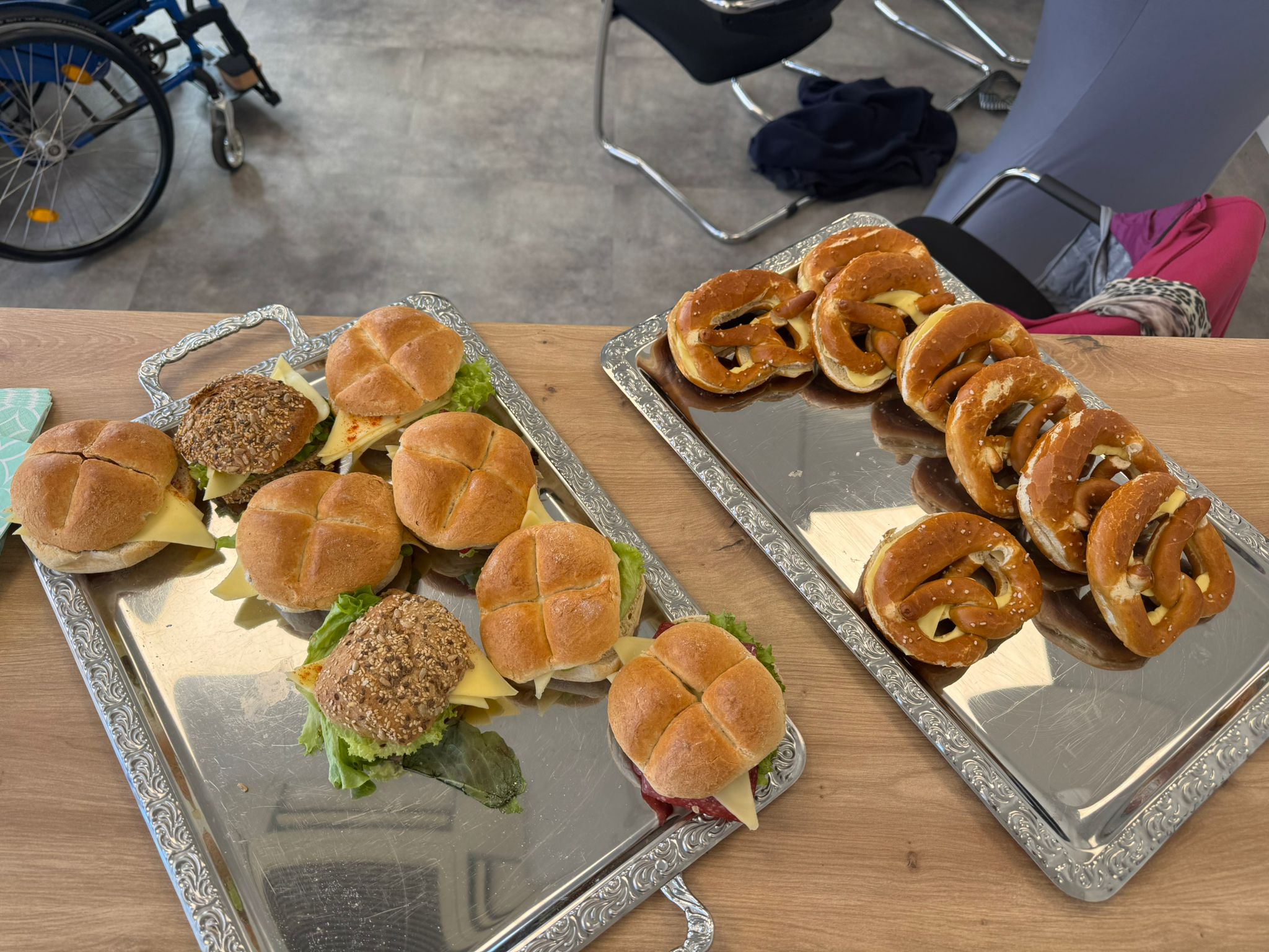 Deshalb lud die SHG Landsberg zur Gehschule am Samstag, 11.10. um 10 Uhr in die Geschäftsräume des Sanitätshauses Stempfle in Landsberg ein. Dort begrüßte Alexander Stempfle die Teilnehmerinnen und Teilnehmer, stellte seine Mitarbeiterinnen, Lena und Luisa und Mitarbeiter Phillip Lenz vor und lud auch mit belegten Semmeln und Brezen zum Imbiss in den Pausen ein. Unsere liebe Pamela verwöhnte uns dann noch mit süßen Leckereien.